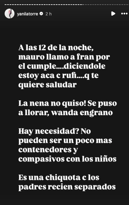 “Se armó a las 12 de la noche. Wanda denuncia a la China. A las 12 de la noche Mauro llamó a Fran por el cumple… diciéndole ‘estoy acá con Rufi que te quiere saludar’. La nena no quiso, se puso a llorar”, comenzó diciendo la panelista de LAM.