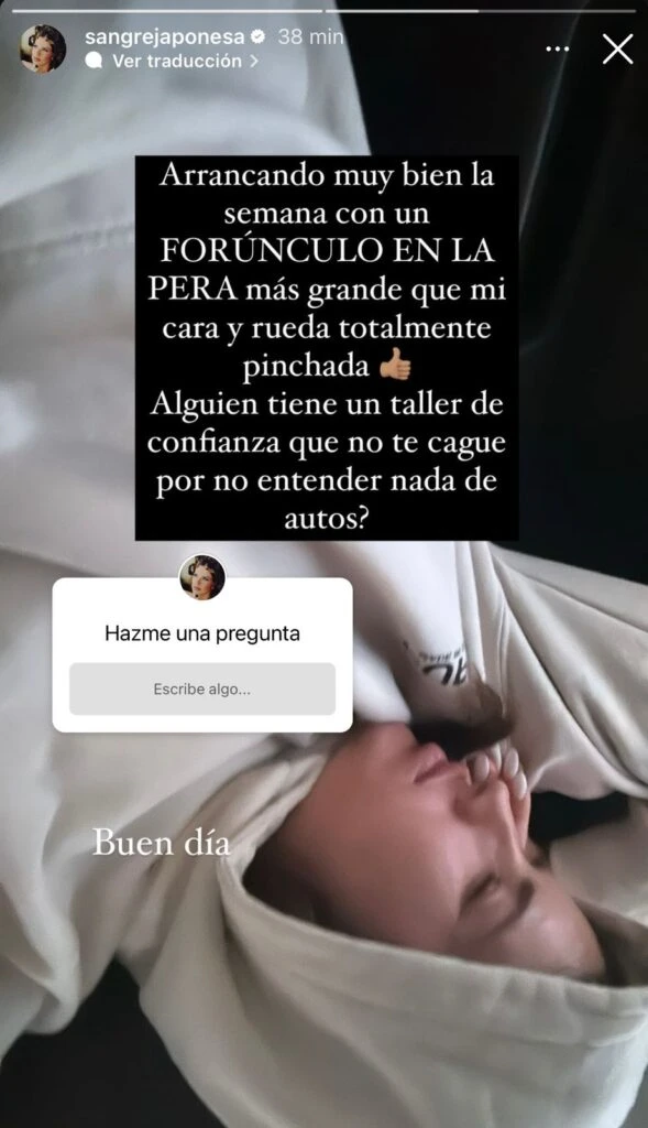 Recostada en su casa y luciendo un buzo con capucha, en tanto se mostraba pensativa la actriz escribió: “Arrancando muy bien la semana con un forúnculo en la pera más grande que mi cara y rueda totalmente pinchada”. Ante estos dos imprevistos, la China pidió ayuda a su comunidad virtual.