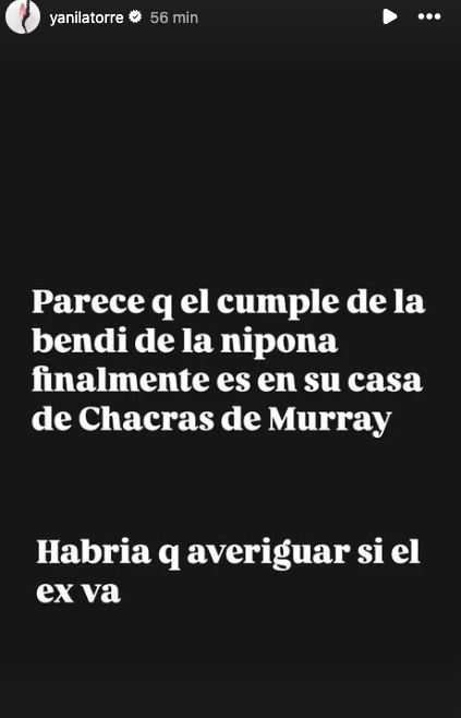 “El progenitor no quiere ir. Tiene razón. Novio nuevo que ni conoce. Le dijo 'el año pasado llevaste a tu garch... de Gran Hermano (por Marcos Ginocchio) y ahora ¿el jugador?’. Le ofreció festejar el cumple en algún lugar común, tipo, Vilas Raquet, la casa de él. La nipona, envalenonadita, le dijo que el cumple era con Mauro.. el drepa quedó tieso y amargado”, destacó Latorre en su historia de Instagram.