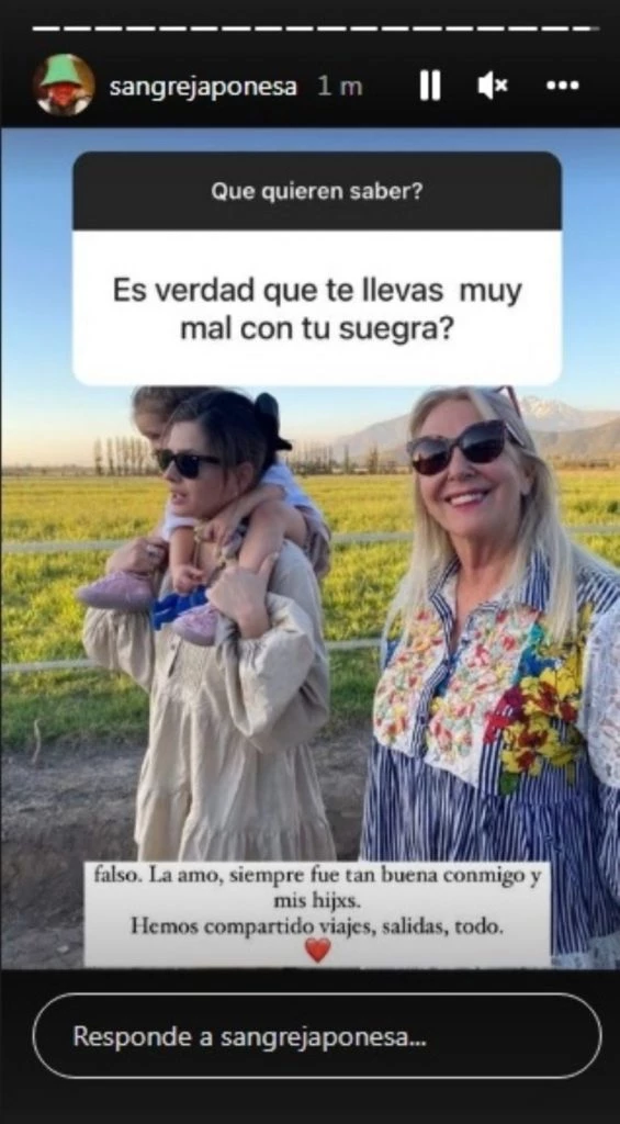 Cansada de todas las suposiciones que hacen de su vida, la China abrió una sección en sus redes para responder todo. Fue entonces que desmintió llevarse mal con la madre de Benjamín Vicuña: "Falso. La amo. Siempre fue tan buena conmigo y mis hijos. Hemos compartido viajes, salidas, todo".