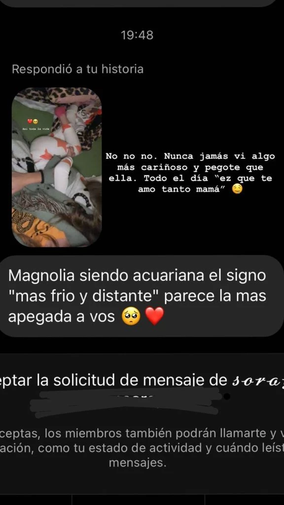 A causa de un mensaje privado que la China recibió en su cuenta de Instagram donde una usuaria le planteaba lo "rara" que era su cercanía con Magnolia considerando que la nena es acuariana, es que la ahora cantante reconoció algunas particularidades en la relación que tienen.