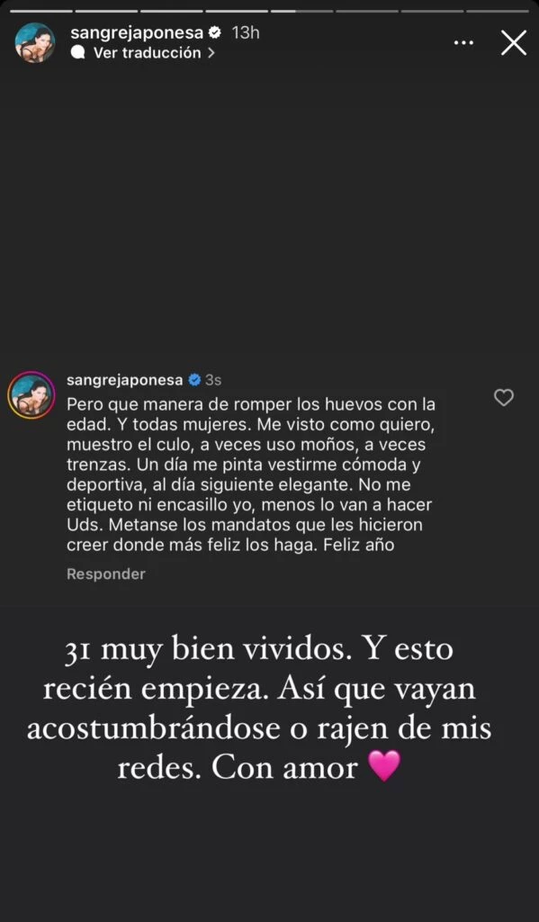 “Un día me pinta vestirme cómoda y deportiva, al día siguiente elegante. No me etiqueto ni encasillo yo, menos lo van a hacer ustedes. Métanse los mandatos que les hicieron creer donde más feliz los haga. Feliz año”, remató la intérprete de Desaniversario y Pasatiempo.