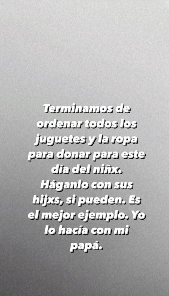 Desde sus redes sociales, donde no solo suele mostrar y compartir imágenes familiares sino que también se expresa sobre temas de actualidad -días atrás lo hizo sobre el jubilado asaltado en Quilmes-, contó a sus seguidores lo que está haciendo y les hizo una propuesta. “Terminamos de ordenar todos los juguetes y la ropa para donar este día del niñx. Háganlo con sus hijxs, si pueden. Es el mejor ejemplo. Yo lo hacía con mi papá”, se sinceró en Instagram.