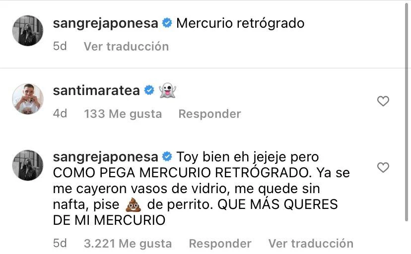 Al respecto, Suárez posteó en su perfil de instagram una foto de su rostro donde pareciera estar haciendo, como quien diría, puchero y escribió: "Mercurio retrógrado". Inmediatamente, la publicación cosechó miles de likes y comentarios, entre ellos el de Santi Maratea que se limitó a contestarle con el emojis de un fantasmita.
