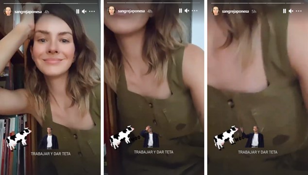 A través de sus stories, Suárez lució cómo se manchó el vestido que llevaba durante su jornada laboral con leche materna y con un divertido gesto en su rostro explicó su situación: “Trabajar y dar la teta”. Además, a modo de broma, utilizó los gifs animados de una vaca y un hombre que se golpea con la mano en la cabeza demostrando que acaba de pasar algo increíble.