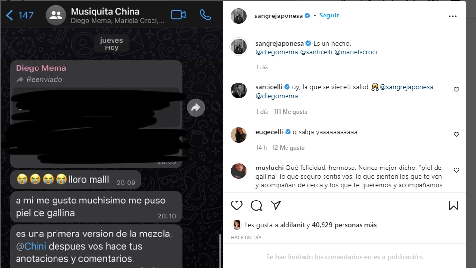 En esa publicación, la actriz escribió: “Es un hecho”. En tanto que en la captura se lee a un compañero de trabajo, que puede ser un productor musical, escribirle a María Eugenia: “Lloro mal, me gustó muchísimo, me puso la piel de gallina. Es una primera versión de la mezcla, China, después vos hacé tus anotaciones y comentarios".