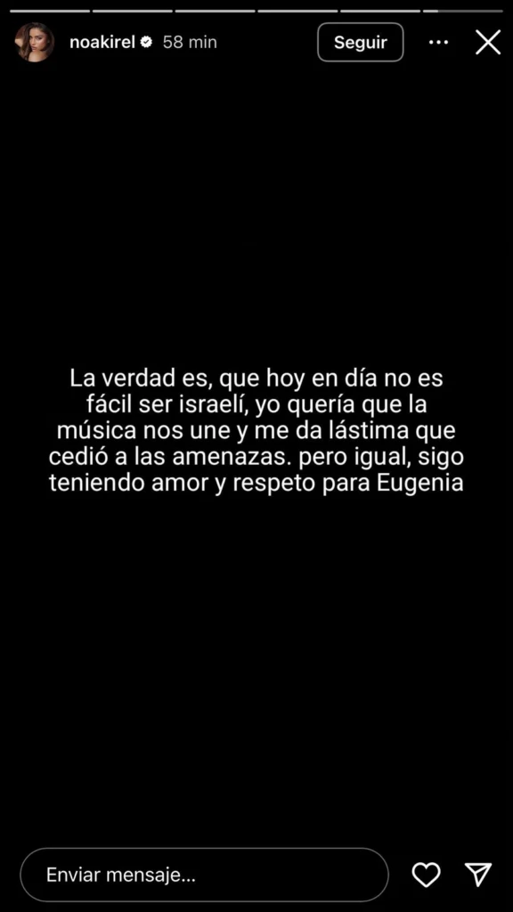 Justamente fue la cantante, Noa la que aseguró la China tristemente debió bajarse del recital luego de ser amenazada: "La verdad es que hoy en día no es fácil ser isarelí, yo quería que la música nos una y me da lástima que cedió ante las amenazadas. Pero igual, sigo teniendo amor y respeto para Eugenia".