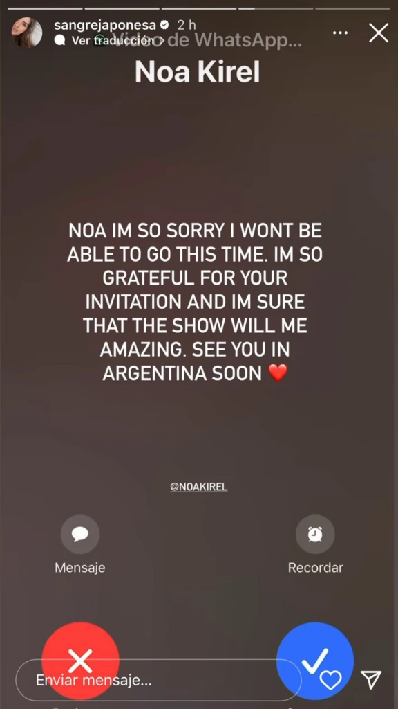 “Noa, lo siento mucho, no podré ir esta vez. Estoy por agradecida por tu invitación y estoy segura que el show será increíble. Nos vemos pronto en Argentina”, escribió la China en su cuenta de Instagram, mediante una historia que compartió.