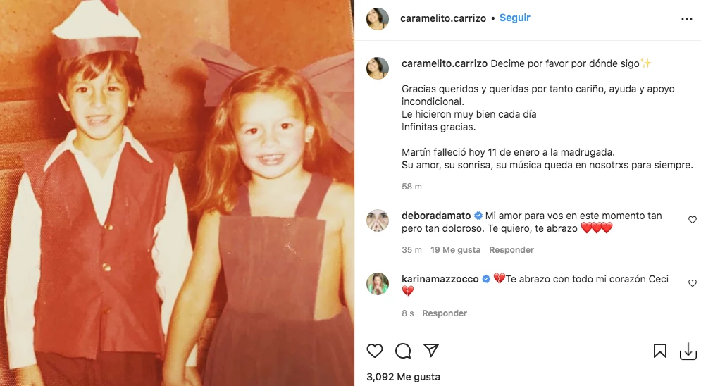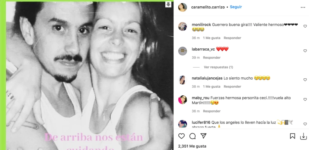 “Decime por favor por donde sigo… Gracias queridos y queridas por tanto cariño, ayuda y apoyo incondicional. Le hicieron muy bien cada día. Infinitas gracias”, expresó Carrizo. “Martín falleció hoy 11 de enero a la madrugada. Su amor, su sonrisa, su música queda en nosotros para siempre”, agregó Cecilia.