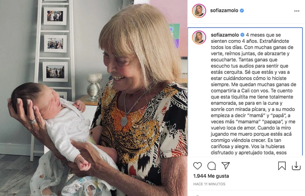 El posteo de Zamolo fue conmovedor ya desde la misma foto, pues puede observarse a su mamá sostenido confortablemente a California, en la unión de generaciones más tierna que pueda haber: la de una abuela con su nieta. En un extenso y sentido texto, la modelo, cuyo último trabajo televisivo se dio en el programa Incorrectas que condujo Moria Casán, recordó a su madre.