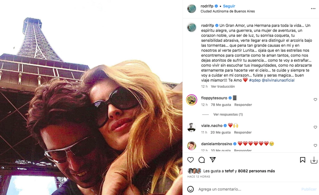 "Una sonrisa coqueta, tu sensibilidad abrasiva, verte llegar era distinguir el arcoíris bajo las tormentas… que pena tan grande causás en mi y en nosotros al verte partir Lunita…” compartió Rodrigo en un posteo que hizo en su cuenta de Instagram. “Ojalá que en las estrellas nos encontremos para contarte como te aman tantos, como nos dejas atónitos de sufrir tu ausencia… ", agregó el empresario.