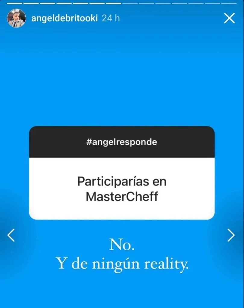Activo en las redes sociales donde a diario, cuando está fuera del aire, interactúa con los millones de seguidores que tiene en las distintas cuentas, Angel de Brito propuso una vez más el ya popular juego de preguntas y respuestas. Y fue por esa vía en la que habló sobre los programas de televisión que están en pantalla y sorprendió al referirse a MasterChef celebrity.