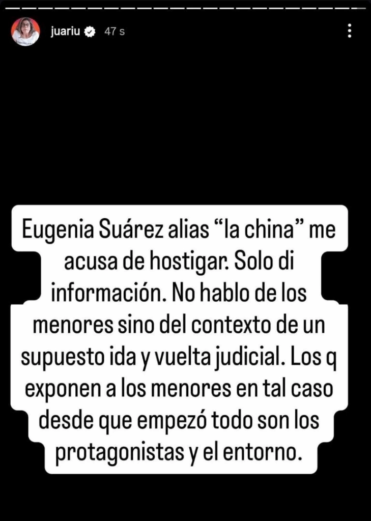 Lejos de quedarse en silencio, Juariu respondió con un posteo igual de contundente. “Eugenia Suárez, alias ‘la China’, me acusa de hostigar. Solo di información”, comenzó diciendo la periodista, marcando una clara distancia entre informar y atacar. Además, aclaró que nunca habló de los menores en sí, sino del contexto general de una situación judicial compleja que ya estaba expuesta públicamente.