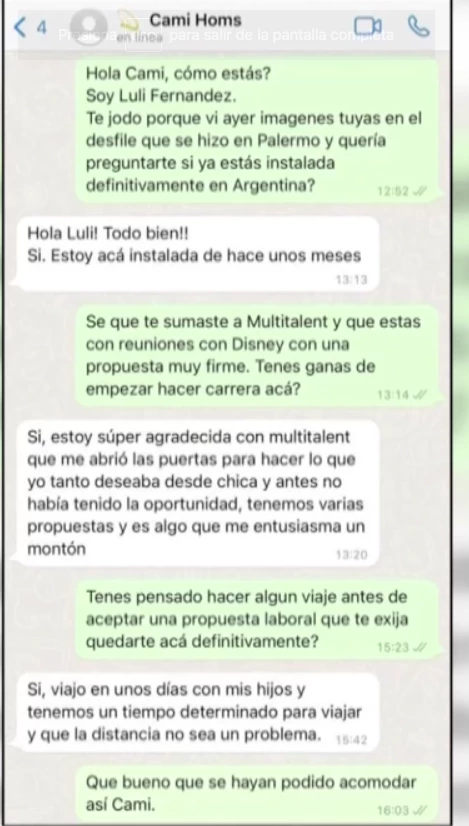 En un chat privado con Luli Fernández, Homs manifestó: “Estoy instalada en Argentina hace dos meses. Tengo muchas ofertas acá". Hasta que relató cómo se organizan como expareja para ver a los nenes: "Viajo en unos días con mis hijos y tenemos un tiempo determinado para viajar y que la distancia no sea un problema”.