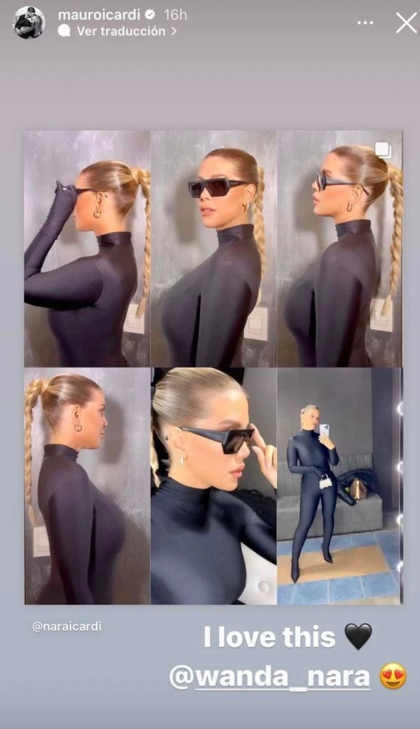 "I love this", escribió el futbolista sobre las fotos que subió Wanda vestida con un sensual catsuit negro que marcaba su figura.