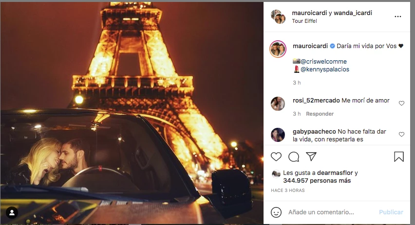 En las últimas horas, el futbolista y la blonda postearon la misma imágen, la misma postal que se sacaron, que consta de una foto muy producida de ellos dos dentro de un auto con la torre Eiffel de fondo y a punto de darse un beso. Lo más fuerte se centra en el mensaje romántico, y algo exagerado tal vez, que pusieron en su Instagram: "Daría mi vida por vos".