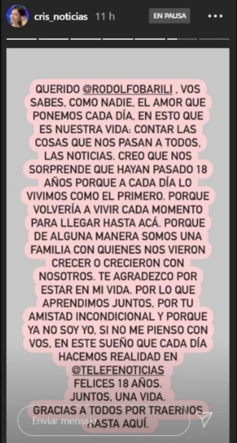"En este sueño que cada día hacemos realidad en Telefe Noticias, felices 18 años. Juntos, una vida. Gracias a todos por traernos hasta acá" finalizó Cristina. El también se mostró feliz por el "aniversario como matrimonio televisivo", sobre todo en un video de Instagram donde ella le dice "soy la que más te duré".