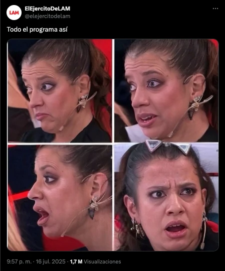 Mientras el clima en el estudio era visiblemente tenso tras el fuerte enfrentamiento que tuvieron Yanina y Nazarena Vélez por la pelea con Fernanda, Pepe -encargado de manejar la cuenta de X del programa de De Brito- decidió subir una serie de imágenes en alusión a las caras que hizo Romina a modo de “reacción”. Sin embargo, las postales fueron de forma burlona y hasta algo agresivas.