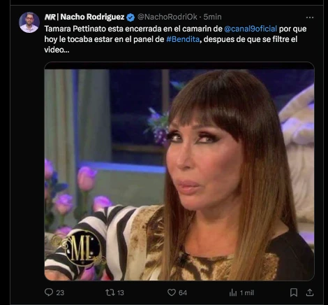 El periodista Nacho Rodríguez publicó en su cuenta de Twitter el estado en que se encuentra en este momento la panelista de Bendita TV. “Tamara Pettinato esta encerrada en el camarín de @canal9oficial por que hoy le tocaba estar en el panel de #Bendita, despues de que se filtre el video…”, posteó.