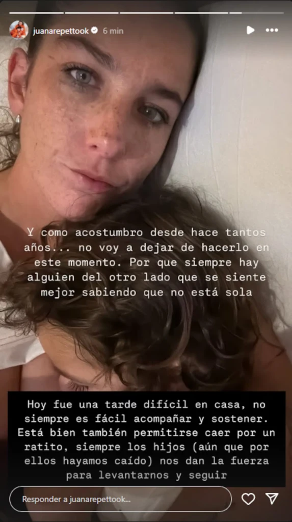 La famosa decidió tomar su teléfono y realizar un descargo hace tan solo horas. Como era de esperarse, Juana siguió con su rutina en redes: “Hoy fue una tarde difícil en casa, no siempre es fácil acompañar y sostener. Está bien también permitirse caer por un ratito".