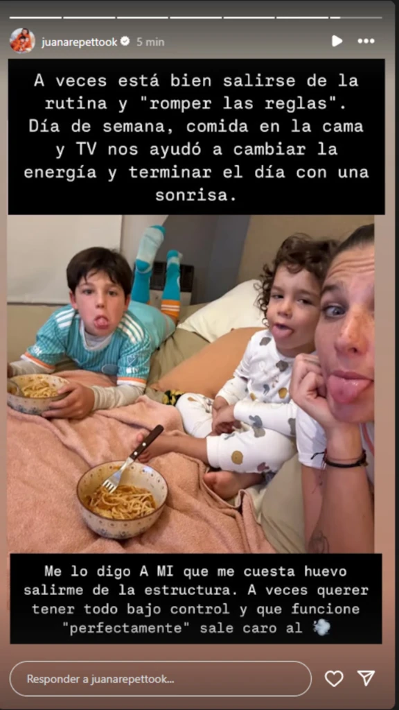 Súper sincera, Juana también confesó que no todo en la vida se trata de seguir las reglas: "A veces está bien salirse de la rutina y ‘romper las reglas’. Día de semana, comida en la cama y TV nos ayudó a cambiar la energía y terminar el día con una sonrisa”.