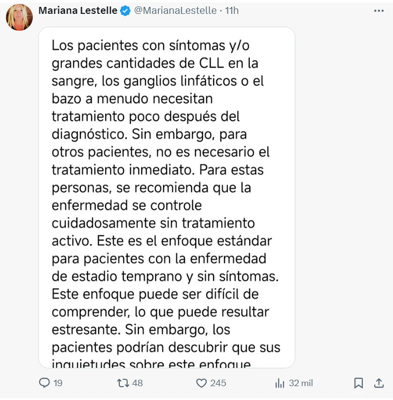 "Presentan linfocitosis y ganglios linfáticos agrandados. No tienen el hígado ni el bazo agrandados; tampoco tienen anemia ni niveles bajos de plaquetas", citó Mariana Lestelle en la ex red del pajarito, que se llenó de preguntas y dudas sobre el tema. A continuación, la profesional compartió cómo son los estadios más avanzados.