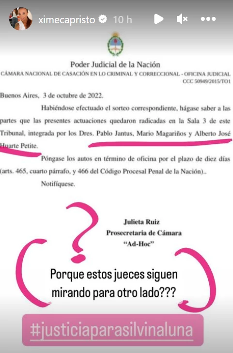 A la par de esta publicación, la ex Gran Hermano se unió a la campaña que pide Justicia por Silvina y publicó en sus historias los nombres de los jueces que hicieron la vista gorda en la causa contra Aníbal Lotocki. “¿Por qué estos jueces siguen mirando para otro lado? Justicia para Silvina”, pidió Ximena.