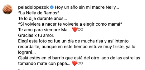 “Gracias x tu amor. Elegí esta foto xq fue un día de mucha risa y así intento recordarte, aunque en este tiempo estuve muy triste, ya lo lograré”, comentó el Pelado, que a partir de la muerte de su madre cargó con una angustia insoportable.