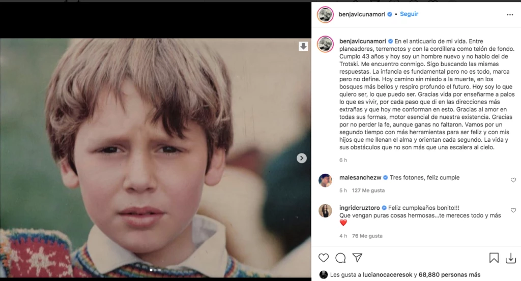 Entre nostálgico y sincero, Vicuña abrió su corazón y reconoció que el paso del tiempo lo enfrentó a duras batallas como fue la partida de Blanquita, su primera hija mujer, en el 2012. “En el anticuario de mi vida. Entre planeadores, terremotos y con la cordillera como telón de fondo. Cumplo 43 años y hoy soy un hombre nuevo y no hablo del de Trotski. Me encuentro conmigo”, confió Benjamín.