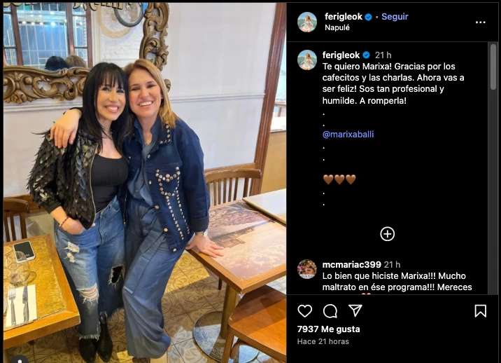 “Te quiero Marixa! Gracias por los cafecitos y las charlas. Ahora vas a ser feliz! Sos tan profesional y humilde. A romperla!”, escribió Iglesias a través de un posteo que hizo en sus redes sociales, sumando fotos junto a Balli y demostrando la buena relación que tienen. Cabe destacar que la panelista habló incluso desde su propia experiencia, ya que desde que se fue de LAM ha podido afianzarse como figura en Canal 13 y todo parece irle genial.