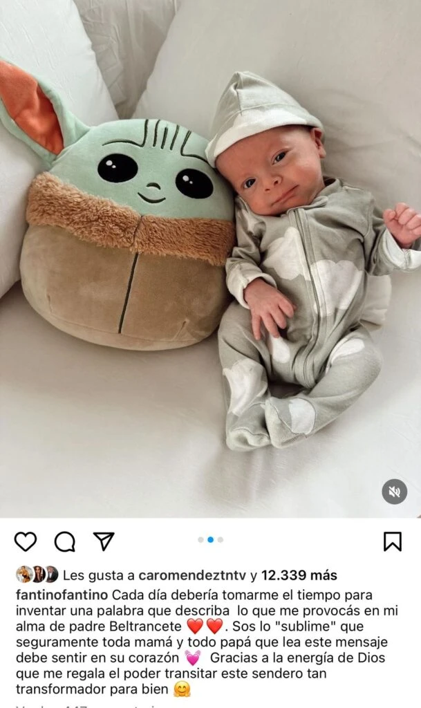 Demostrando que es un padre presente y dedicado, acompañando a Coni en el cuidado y la crianza del bebé, Fantino es quien intenta bañar, darle de comer o compartir momentos con el niño quien, además, duerme la siesta a su lado mientras trabaja.