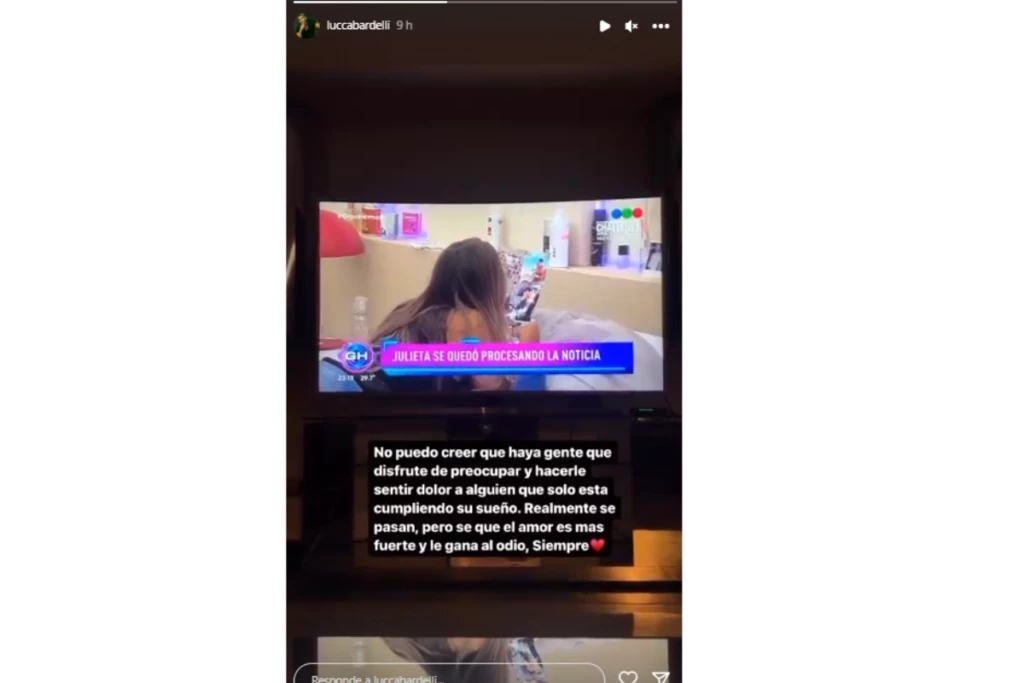 En los últimos días afuera acusaron a Lucca Bardelli quien es su pareja de haberle sido infiel a la "hermanita", rumor que salió a desmentir y hasta subió una historia de Instagram donde se la puede ver a Julieta viendo el collage de imagen que él le envió: "No puedo creer que haya gente que disfrute de preocupar y hacerle sentir dolor a alguien que está cumpliendo su sueño. Realmente se pasan, pero se que el amor es más fuerte y le gana al odio, siempre", aseguró.