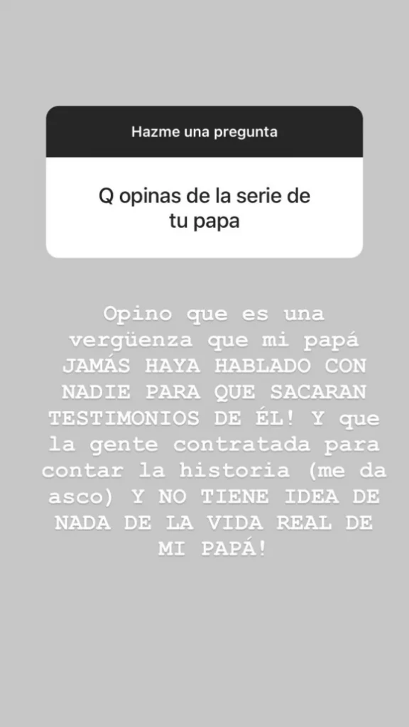 "Opino que es una vergüenza que mi papá jamás haya hablado con nadie para que sacaran testimonios de él. Y que la gente contratada para contar la historia (me da asco) no tiene idea de nada de la vida real de mi papá", aseguró.