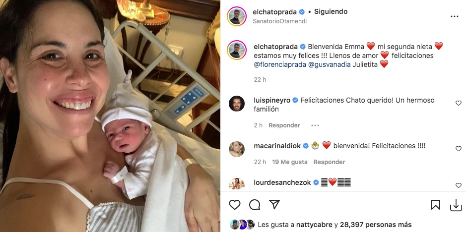 "Bienvenida Emma, mi segunda nieta... Estamos muy felices!!! Llenos de amor!!", le dedicó el Chato a su nieta, en redes sociales, junto a un tierno posteo de su hija con la bebé en brazos.