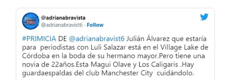 Tras investigar la identidad del caballero, en el ciclo de Adrián Pallares y Rodrigo Lussich ampliaron: “El nuevo amor futbolero de Luciana Salazar confirmadísimo es Julián Álvarez. Ya fue mucho a su casa, todos los vecinos del edificio lo vieron un montón, a ella se la vio en el palco de River, lo fue a ver a él".