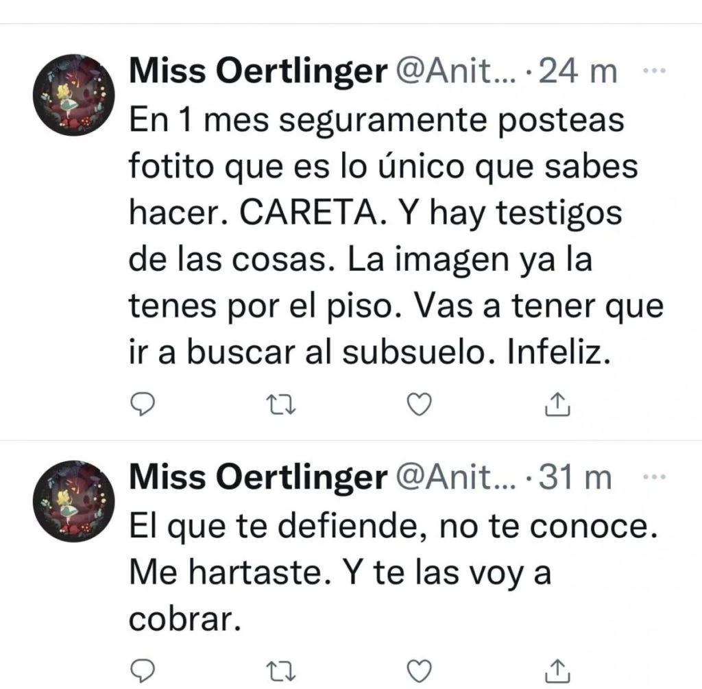 "Agarrate, porque ahora me cansé yo. Violento, misógino y mal padre. En un mes seguro posteas una fotito con lo único que sabés hacer, careta. La imagen ya la tenés por el piso y vas a tener que ir a buscarla al subsuelo, infeliz. El que te defiende es porque no te conoce. Me hartaste y te lo voy a cobrar”, cerró.
