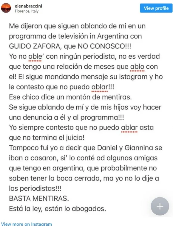 En esa línea de revelaciones Braccini optó por desmentir la teoría que reza que fue la encargada de soltar el dato de una supuesta boda entre Osvaldo y la hija de Diego Maradona. "Tampoco fui yo quien dijo que Daniel y Gianina se iban a casar, se lo conté a algunas amigas de Argentina que probablemente no saben tener la boca cerrada pero no se lo dije a los periodistas", manifestó.