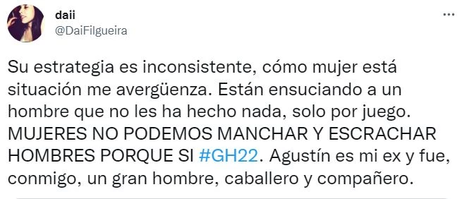 “Su estrategia es inconsistente. Como mujer, está situación me avergüenza. Están ensuciando a un hombre que no les ha hecho nada, solo por juego. Mujeres, no podemos manchar y escrachar hombres porque sí”, escribió la joven.