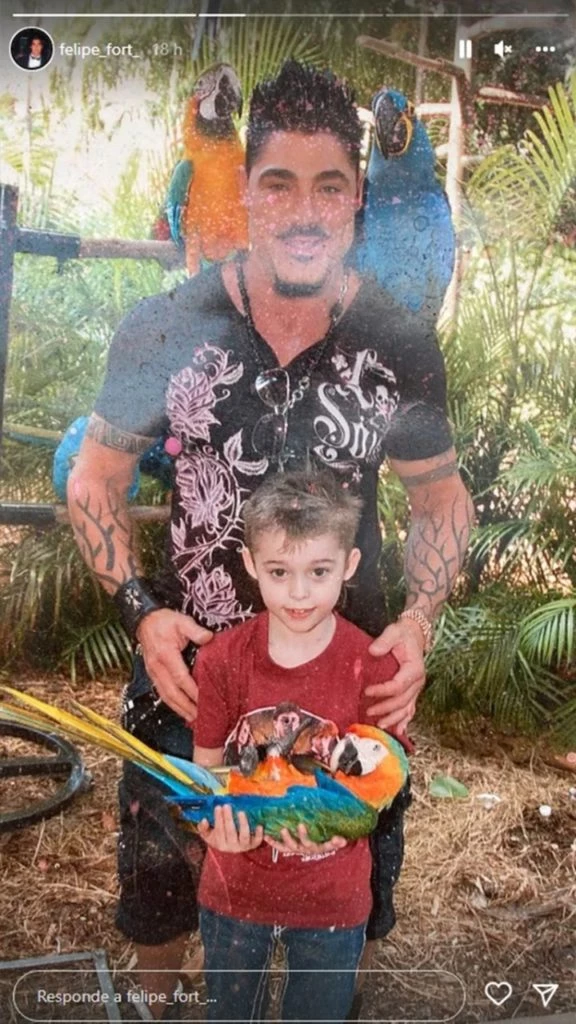 Si bien no escribió nada junto a la postal, dejó en claro que es uno de los momentos más felices que vivió junto a su padre. En la foto se lo ve a Ricardo Fort con dos coloridos guacamayos, uno en cada hombro. Mientras que Felipe sostiene uno en sus brazos.