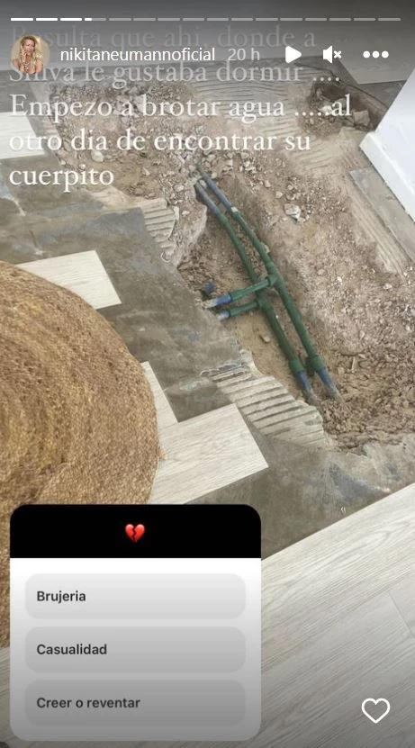 "Resulta que ahí, donde a Shiva le gustaba dormir, empezó a brotar agua. Al otro día de encontrar su cuerpito", contó Neumann, conmovida, y le propuso a su comunidad votar con su opinón: "¿Brujería? ¿Casualidad? ¿Creer o reventar?".