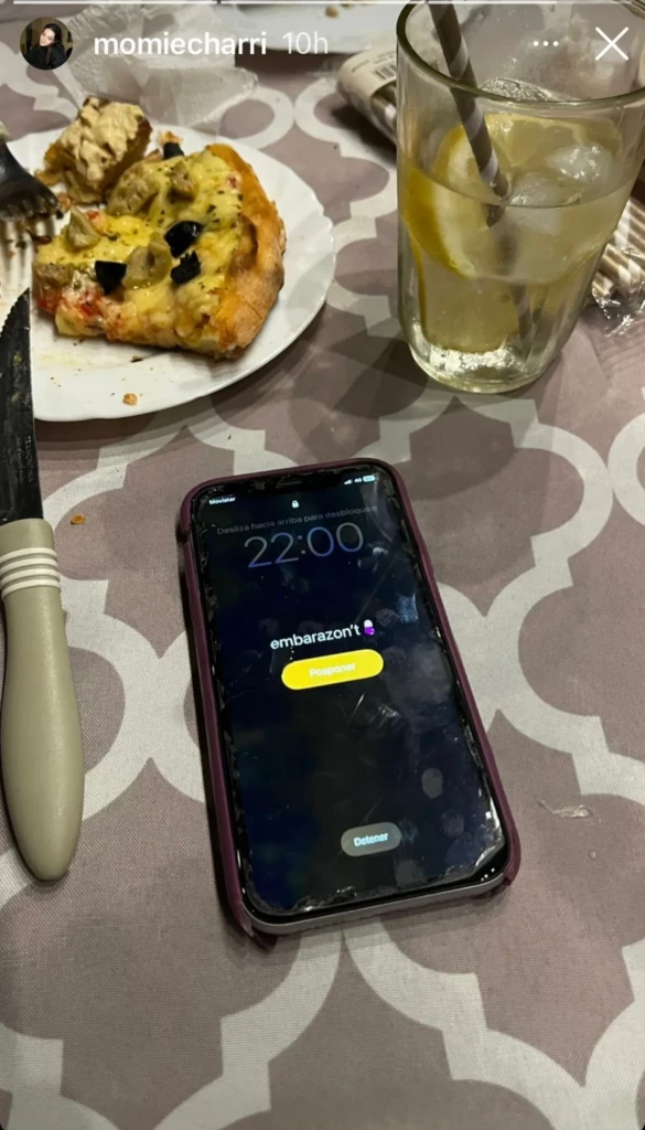 “Embarazon’t”, decía la alarma que comenzó sonarle a Morena Echarri, quien mientras degustaba una porción de pizza y un trago, tuvo que interrumpir su cena. De todas formas, su foto generó conciencia en diferentes seguidores.