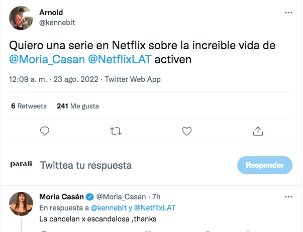 Pero como las que están en boga son las series, a un usuario de Twitter se le ocurrió mandarle un mensaje cortito, directo y contundente a Netflix: "Quiero una serie sobre la increíble vida de Moria Casán", escribió un internauta identificado como Arnold (@kennebeit), quien arrobó a la productora de contenidos multinacional.