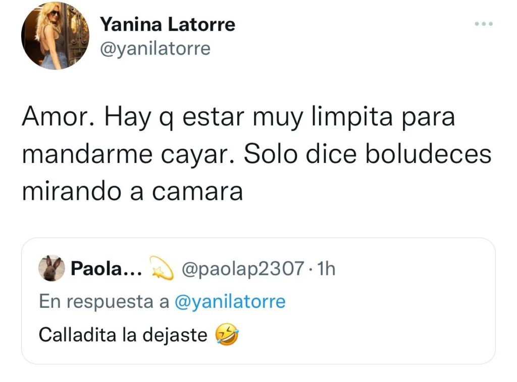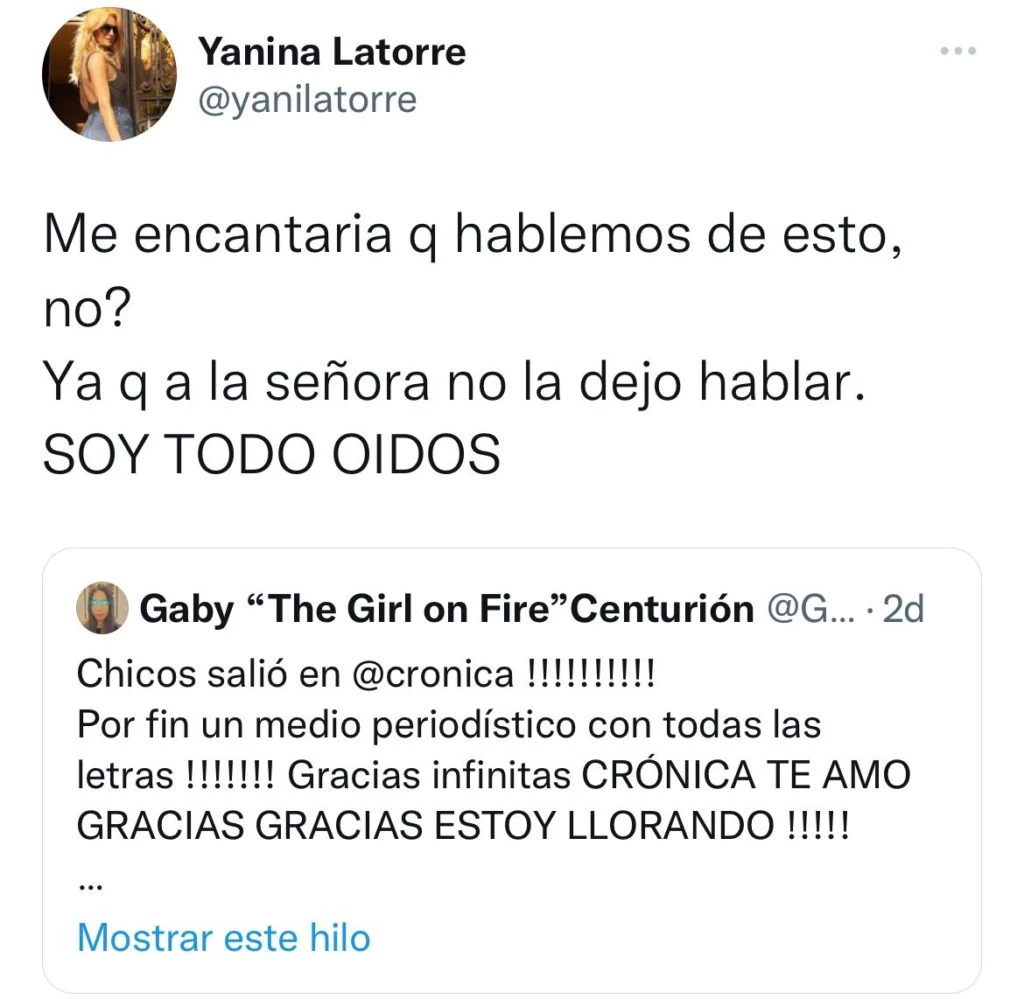 Cuando LAM se transmitía en vivo, Yanina Latorre en paralelo se encargó de hundir a Ana Rosenfeld con mensajes en su cuenta de Twitter mostrando algunas cuestiones judiciales que la abogada tiene en su contra: "Amor. Hay q estar muy limpita para mandarme callar. Solo dice boludeces mirando a cámara. Me encantaría que hablemos de esto, no? Manda a borrar todas las notas. Que lastima".