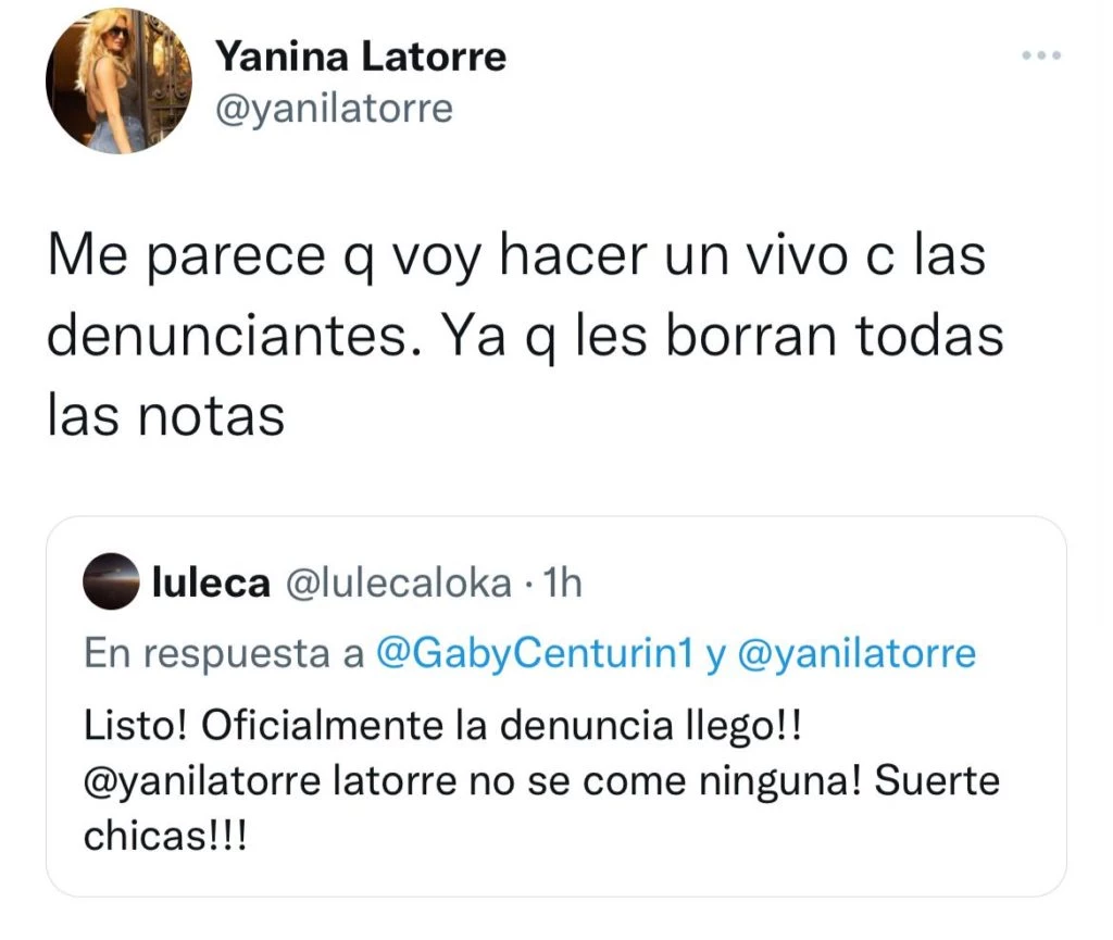 Yanina Latorre dispuesta a cumplir lo que le advirtió a Ana Rosenfeld en vivo escribió en su cuenta de Twitter: "Me parece que voy hacer un vivo con las denunciantes. Ya que les borran todas las notas. De lo único que habla es de su marido". ¿Se viene una nueva guerra mediática?