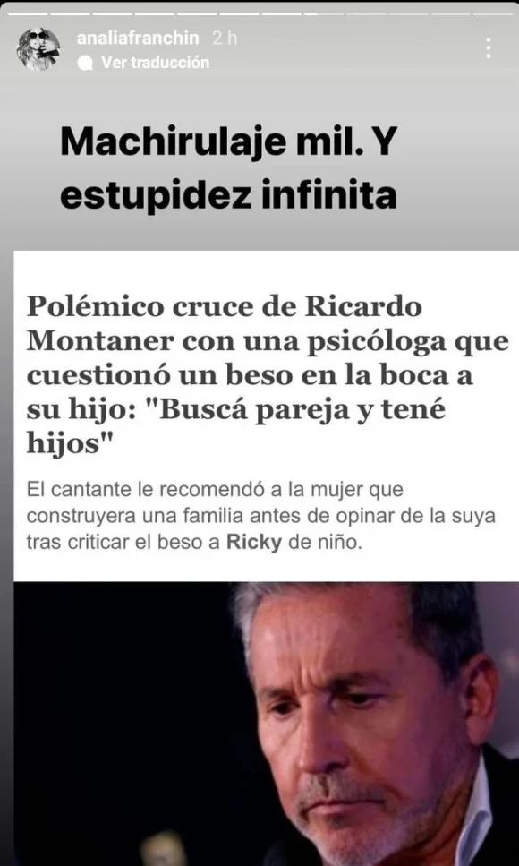 En sus historias de Instagram, la periodista compartió la noticia que informaba un medio de espectáculos sobre los dichos de exjurado de La Voz Argentina y arremetió fuerte contra él. "Machirulaje mil y estupidez infinita", señaló Analía sobre las palabras que utilizó Ricardo para contestarle a la psicóloga.