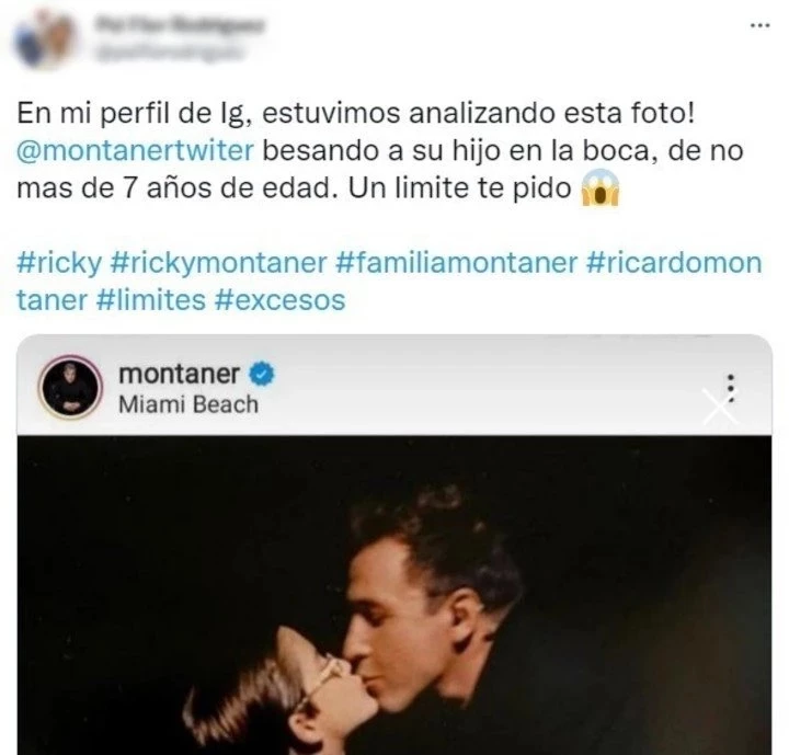 Si bien recibió muchos comentarios negativos, hubo uno en especial por parte de psicóloga que le molestó mucho. "¡En mi perfil de Instagram estuvimos analizando esta foto! @montanertwiter besando a su hijo en la boca, de no más de 7 años de edad. Un límite te pido", fueron las palabras que utilizó la profesional.