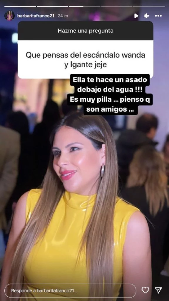 "¿Qué pensás del escándalo Wanda y L-Gante? jeje", fue la pregunta que un seguidor le hizo a la amiga de Pampita en las redes sociales. Fue entonces que Barby decidió responder filosa y a favor de Wanda Nara: "¡¡¡Ella te hace un asado debajo del agua!!! Es muy pilla… pienso que son amigos…".