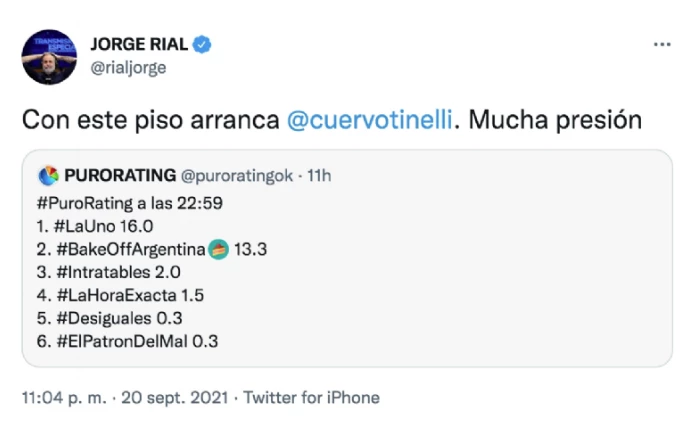 En definitiva, Rial metió un tuit filoso, en el que posteó el rating a la hora de arranque de Marcelo y escribió: “Con este piso arranca Tinelli. Mucha presión”. Todo en referencia a los 16 puntos que marcó la novela de Polka y en una especie de alusión a que desde ese momento el conductor de ShowMatch debía ratificar su condición de exitoso para sostener el volumen de espectadores.