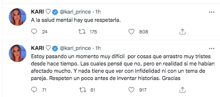 “Soy una persona que me siento, por momentos, muy triste. Y, en este momento, no la estoy pasando para nada bien", escribió Karina en una storie de su Instagram. Unas líneas muy sentidas, que actúan como un síntoma de un semblante de angustia.