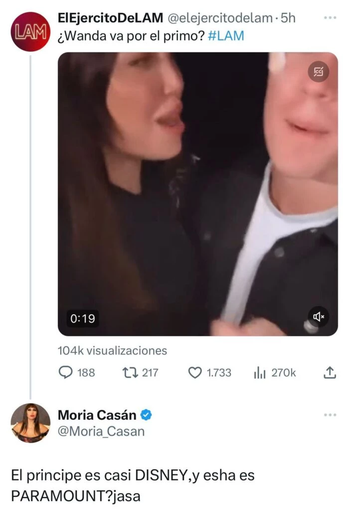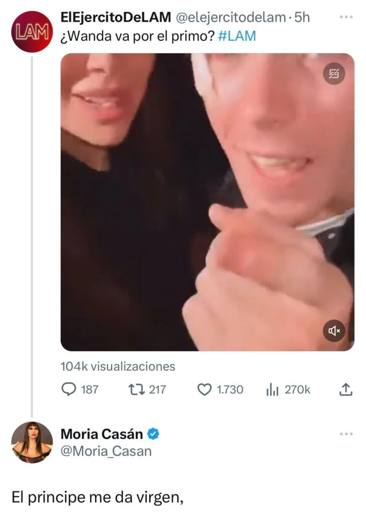 La diva, que se encuentra al acecho luego de su cruce con Mauro Icardi, compartió su postura y generó polémica. Después de que en la cuenta de @ElEjercitoDeLAM compartiera las imágenes y postulara: “¿Wanda va por el Primo?”, ella comentó: “El príncipe me da a Virgen”. Y cerró: “El principe es casi DISNEY,y esha es